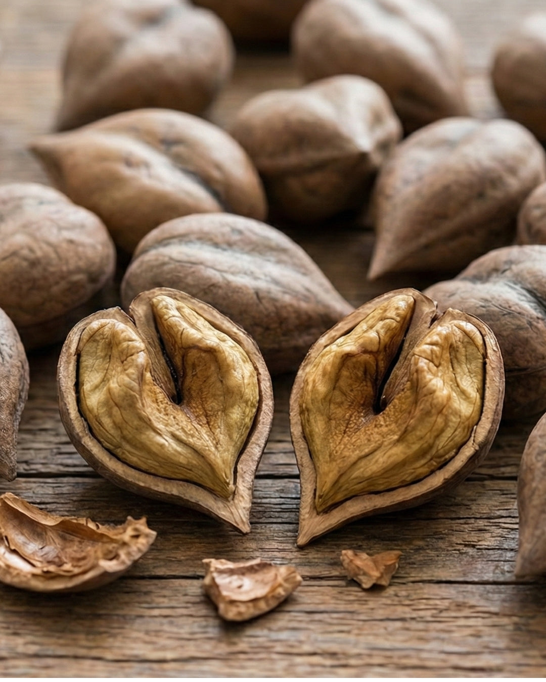 Det här är något för dig som vill ha något unikt – nötterna är faktiskt formade som hjärtan! Smaken är mild och krämig, helt utan den beska som vanliga valnötter kan ha i skalet. Trädet får enorma blad som ger en nästan tropisk känsla i trädgården. Växer snabbt, blir stort och är en riktig snackis.