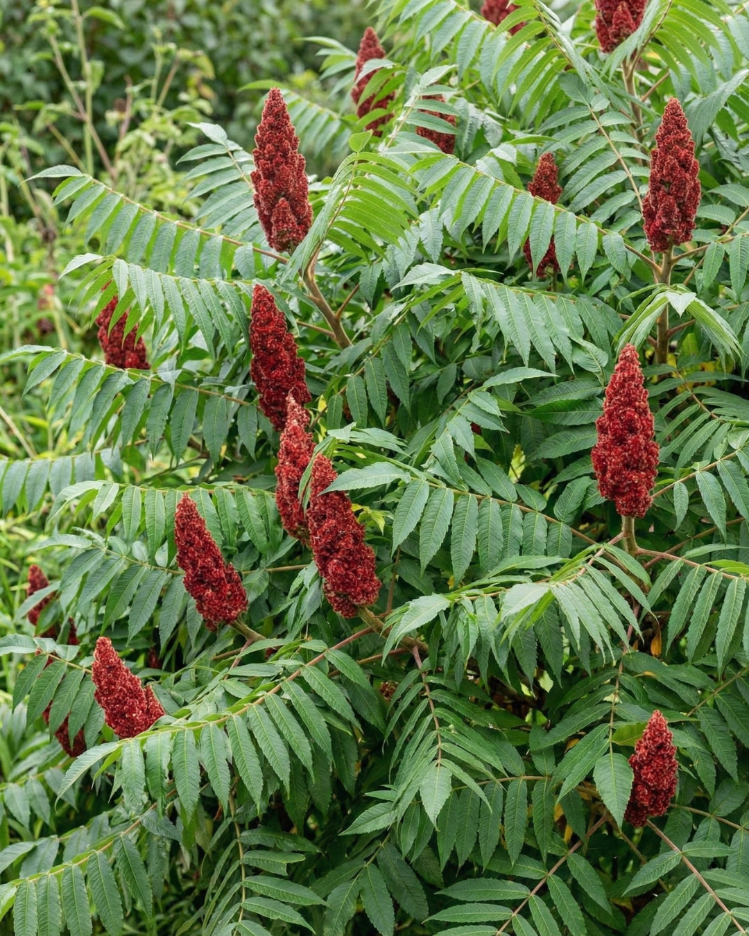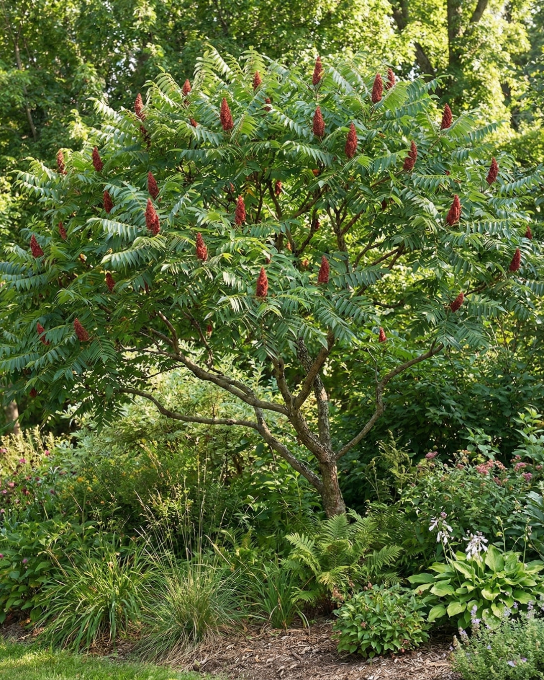 Ser nästan ut som en palm med sina stora blad och ger en exotisk känsla i trädgården. På hösten får den en helt otrolig, lysande röd färg som syns på långt håll. Den skjuter ofta rotskott, så ge den gärna en egen yta där den får breda ut sig (eller kör över skotten med gräsklipparen). Får roliga röda kolvar som sitter kvar på vintern.