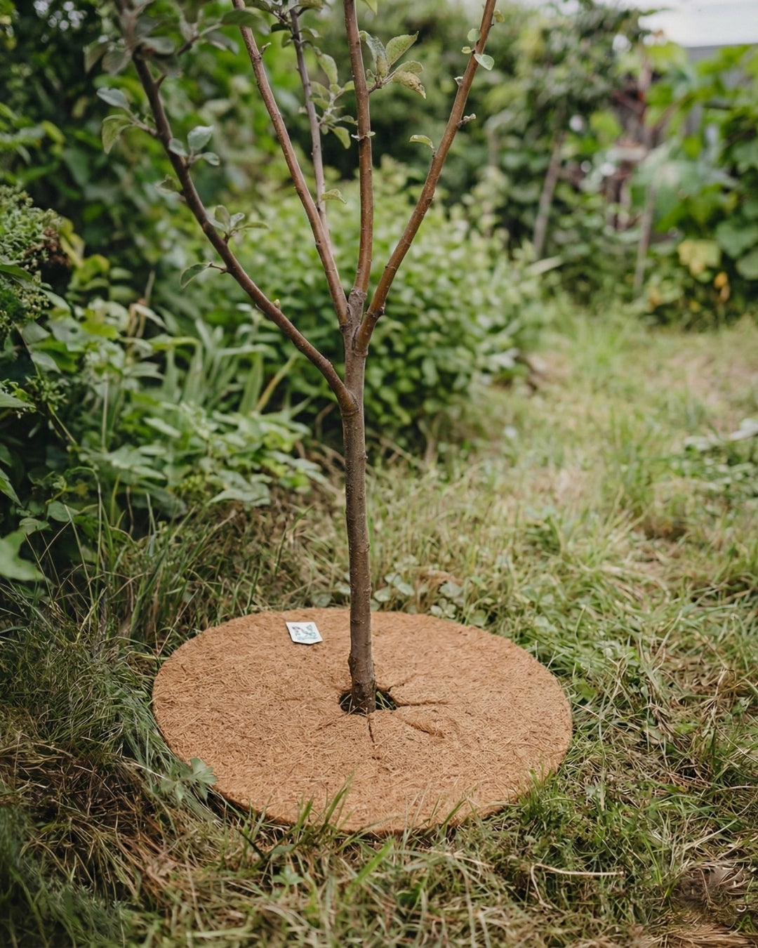 Rund matta av kokosfiber som förhindrar ogräs och bevarar fukten i jorden. Kokosfiber är ett naturmaterial och bryts ned automatiskt över tid. Snittet mot hålet i mitten gör den enkel att placera runt träd eller buskar. Kan ev. täckas med bark.